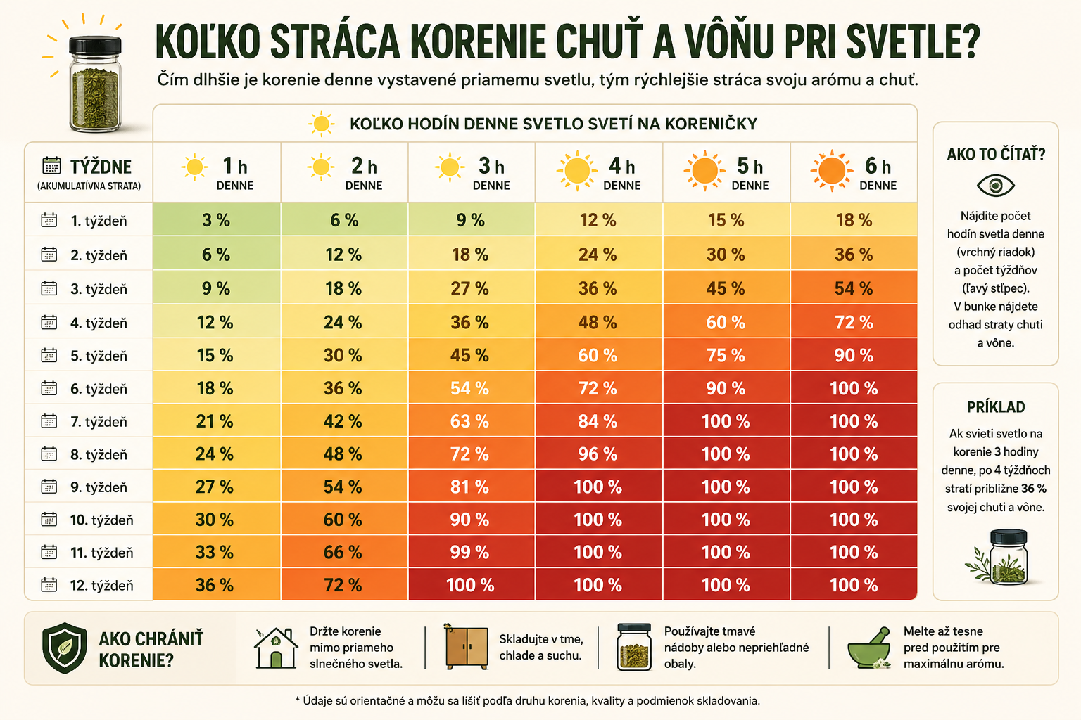 Pripravil som pre vás tabuľku, kde máte pekne znázornené, koľko času priameho slnečného svetla denne na vaše sklenené koreničky na linke stačí na to, aby sa z nich stalo korenie bez chuti a vône ktoré vo vašom jedle veľa muziky nenarobí.