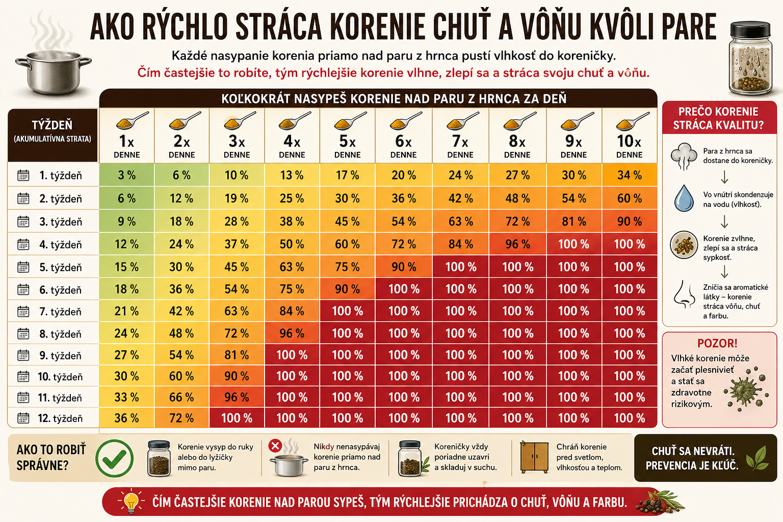 A čo s vlhkosťou? To je ešte jednoduchšie, než si myslíte. Stačí vám obyčajná kávová lyžička, ktorú má doma každý. Naberte potrebné množstvo korenia z koreničky a pridajte ho do hrnca.